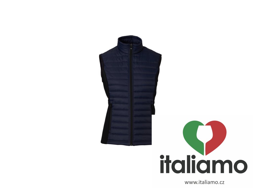 Dámská zateplená vesta, soft-shellové boky, zapínání na plastový zip s kovovým jezdcem „semi-auto lock“ a přizpůsobeným taháčkem, dvě boční kapsy na zip.
